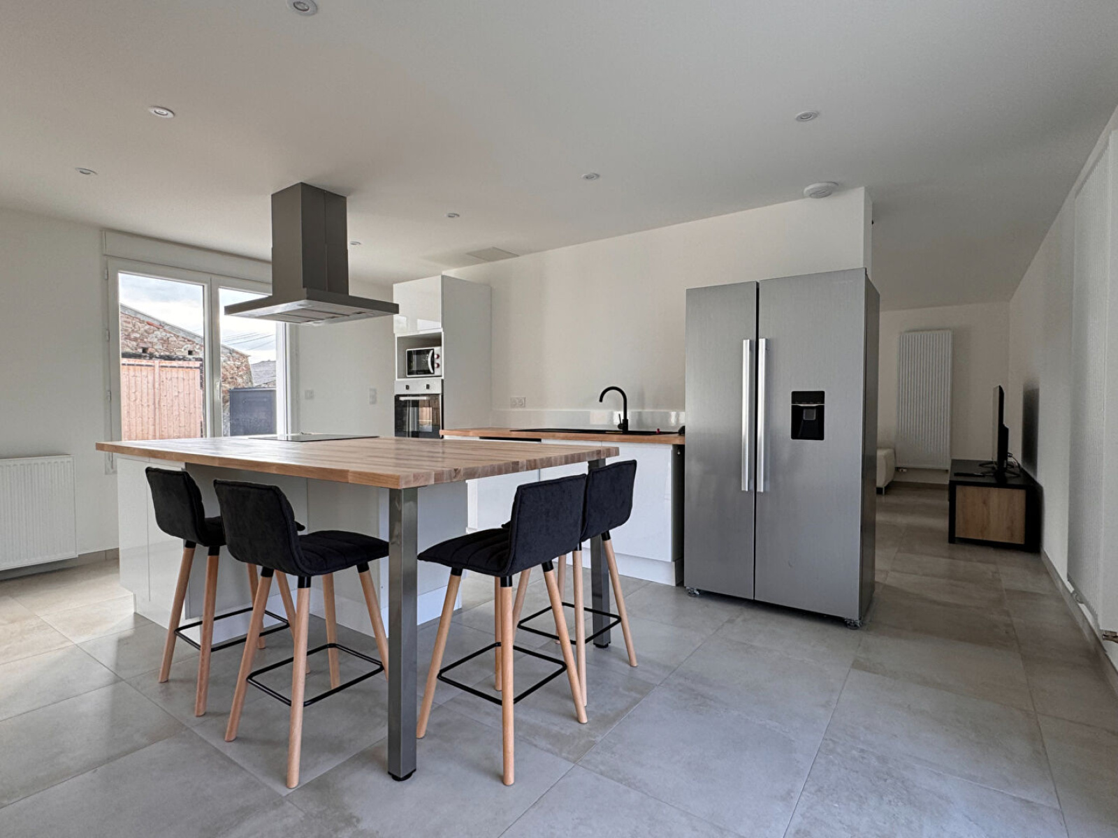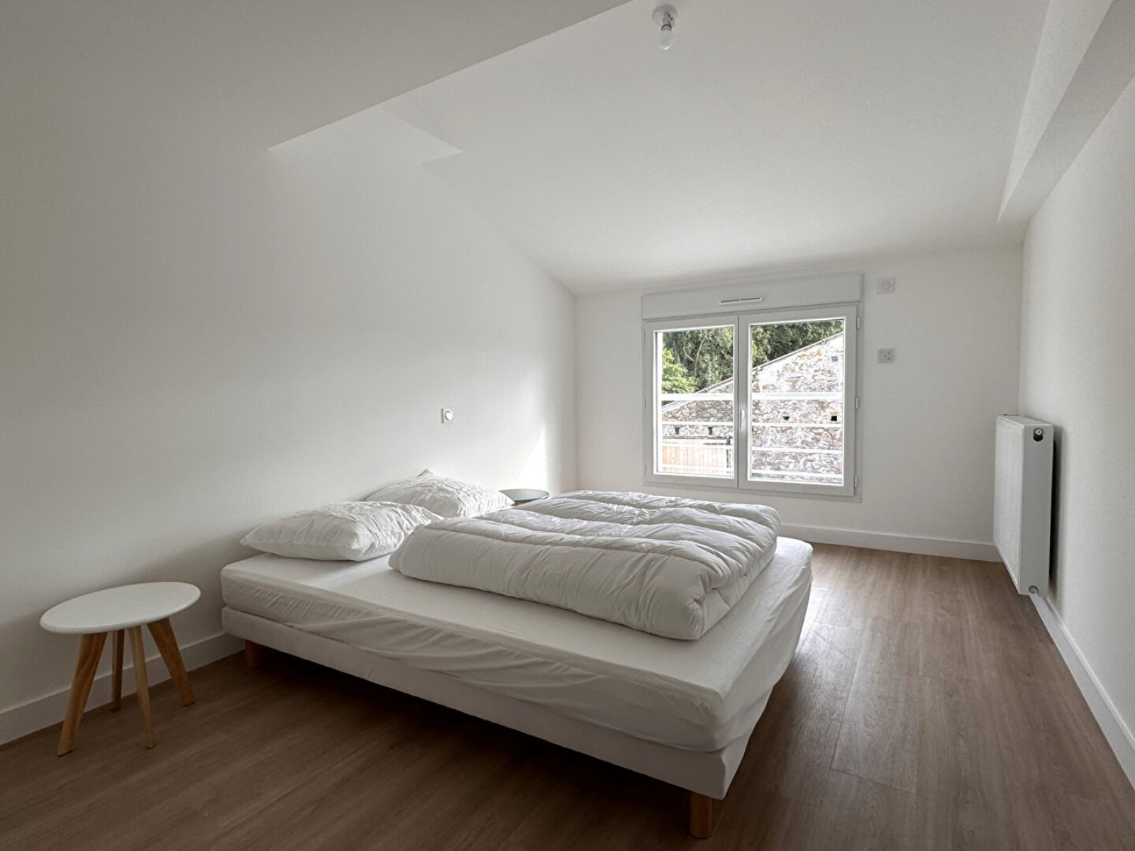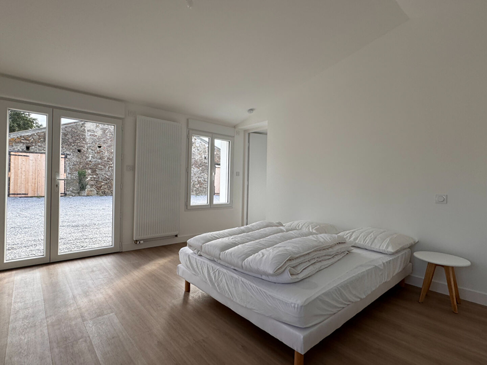 Détails techniques : isolation et doublage neufs, menuiseries PVC DV + VRE, assainissement autonome neuf, pompe à chaleur air/eau par radiateurs, sanitaires neufs, cuisine aménagée à prévoir).
