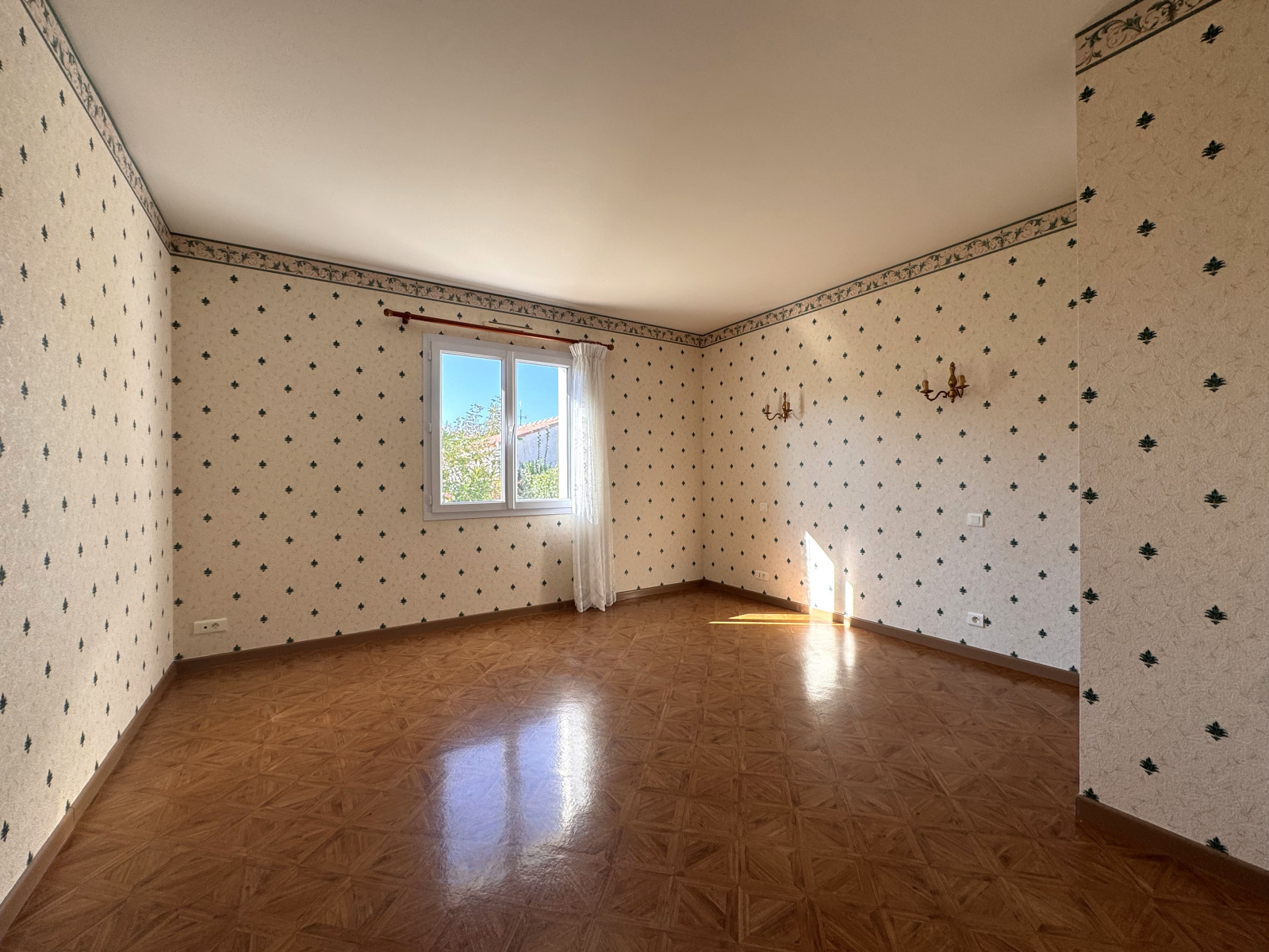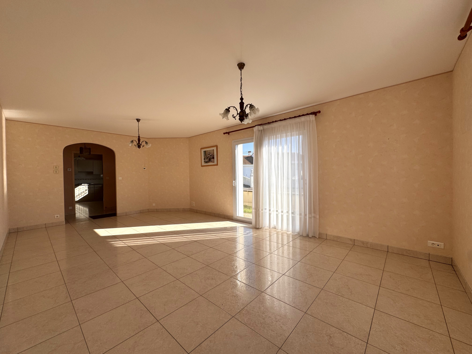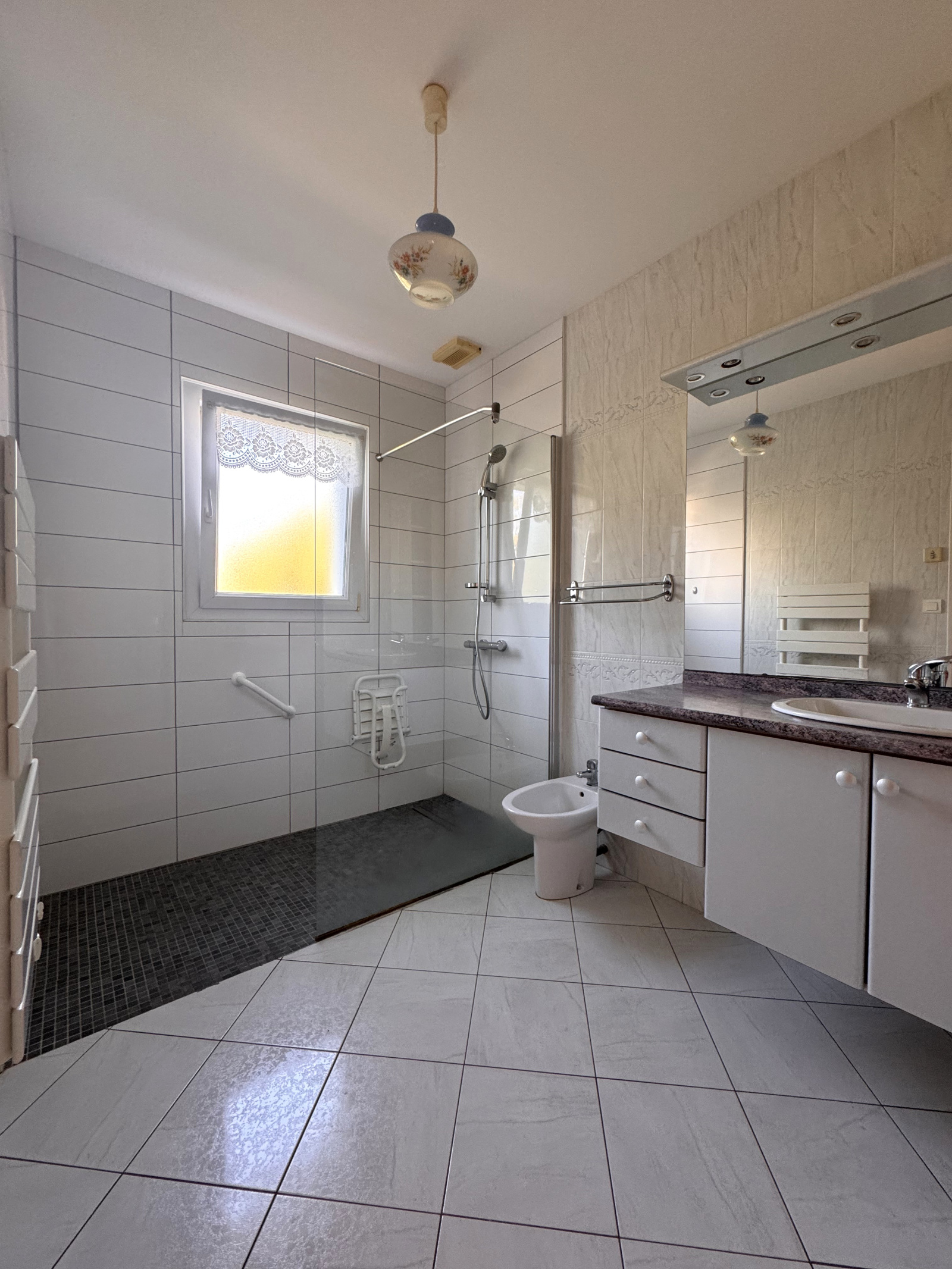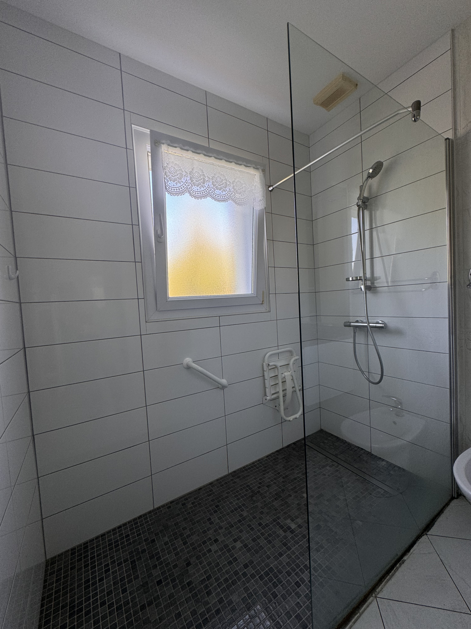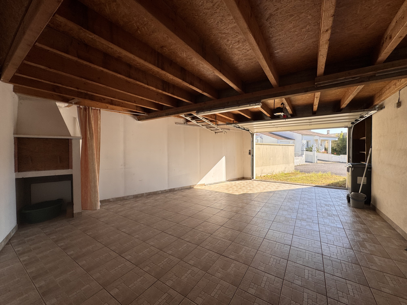 Elle se compose d'une entrée, un salon-séjour, une cuisine aménagée et équipée avec espace repas, une arrière-cuisine, dégagement avec placard, une salle d'eau avec douche italienne et placard, wc, 2 chambres (dont une de 16 m²) et un garage attenant de 34 m² carrelé avec faux-grenier.