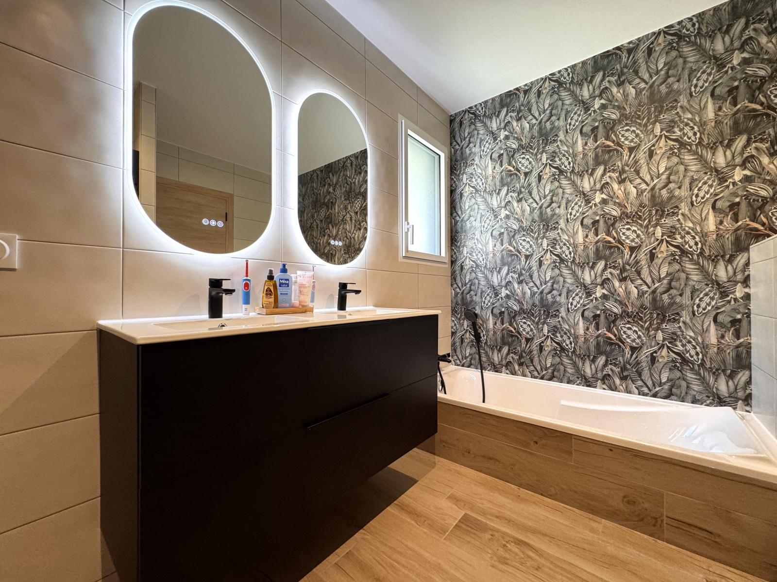 Un second espace nuit dessert trois chambres, toutes équipées de placards aménagés, ainsi qu’une salle de bains avec baignoire, douche et WC.