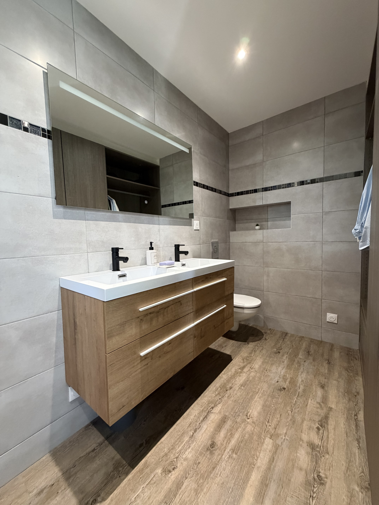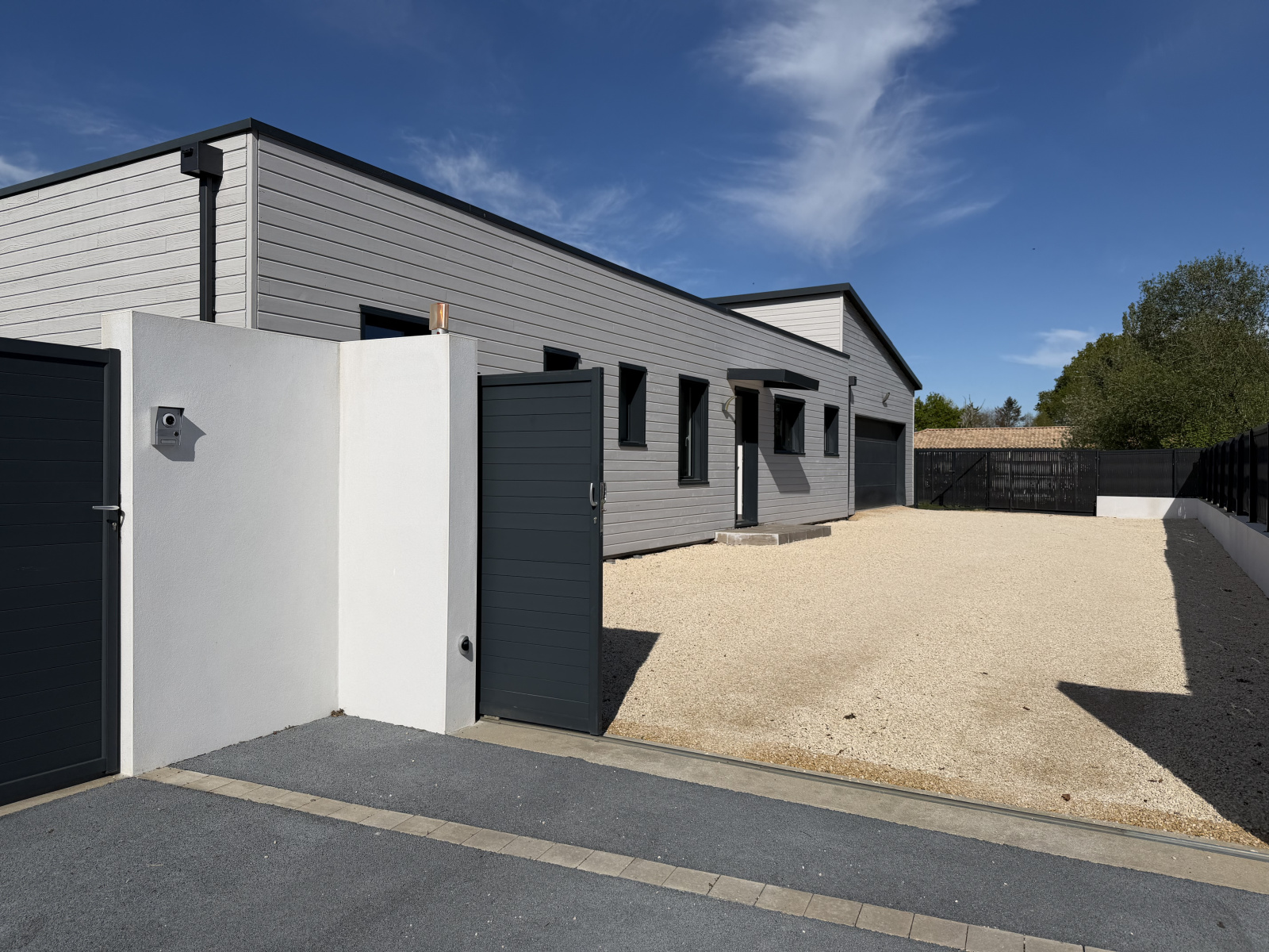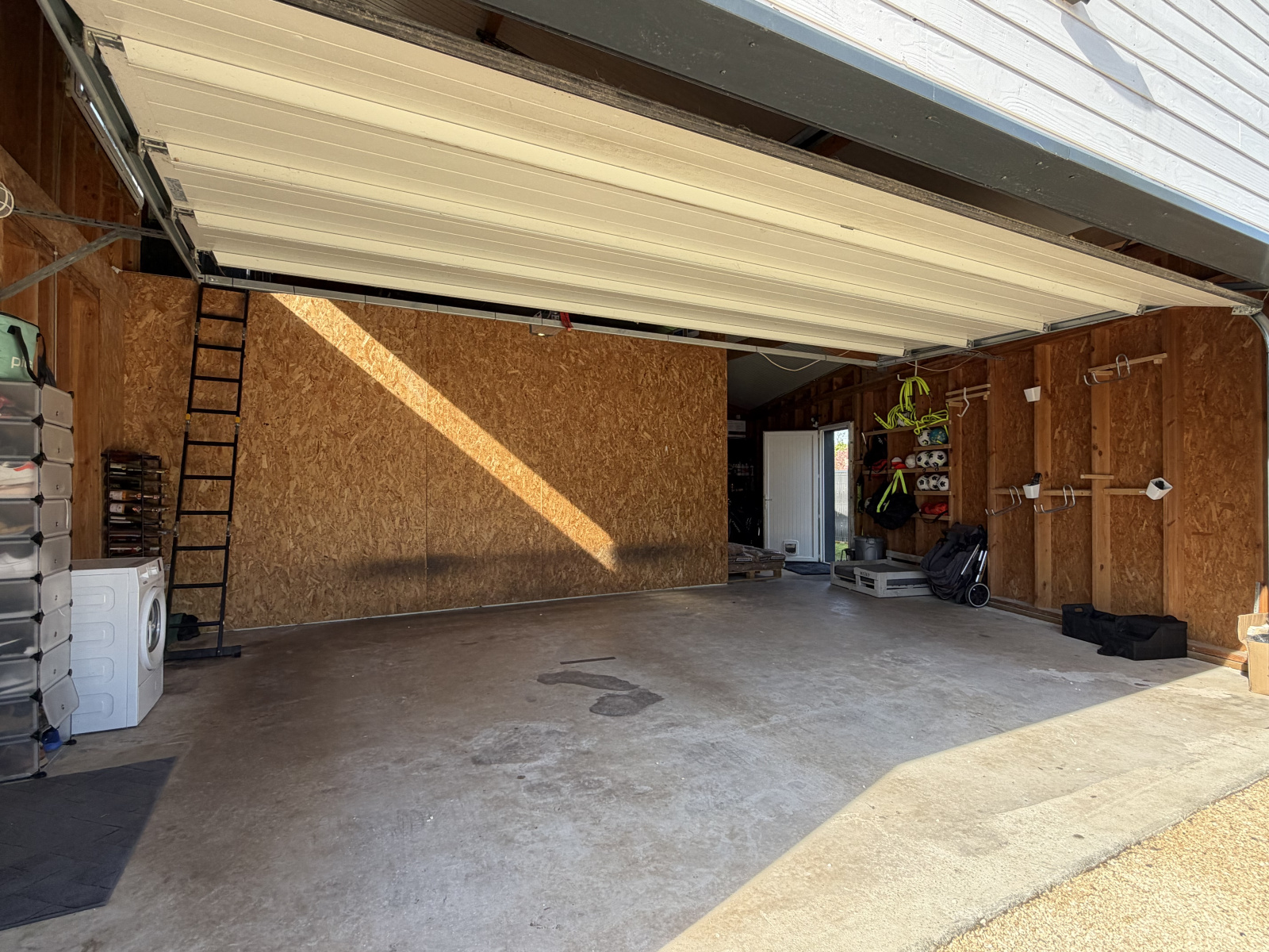 Grand garage attenant de 50 m² avec portail motorisé et faux-grenier.